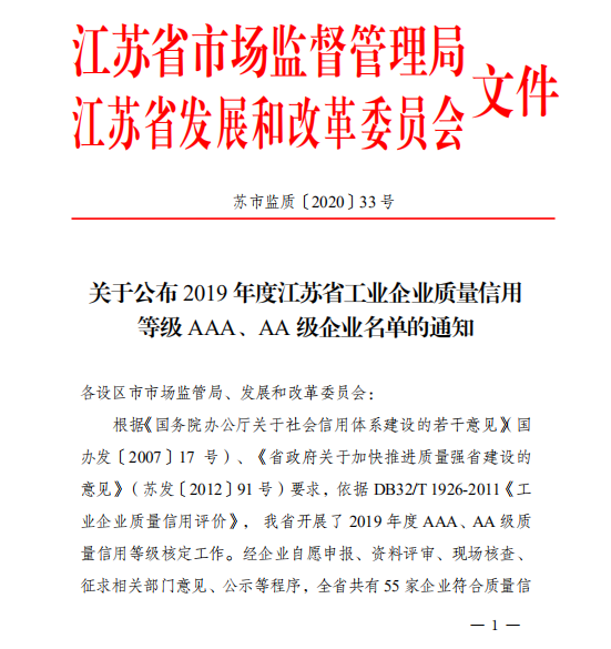 我司榮獲2019年度工業(yè)企業(yè)質(zhì)量信用等級AAA級企業(yè)榮譽(yù)
