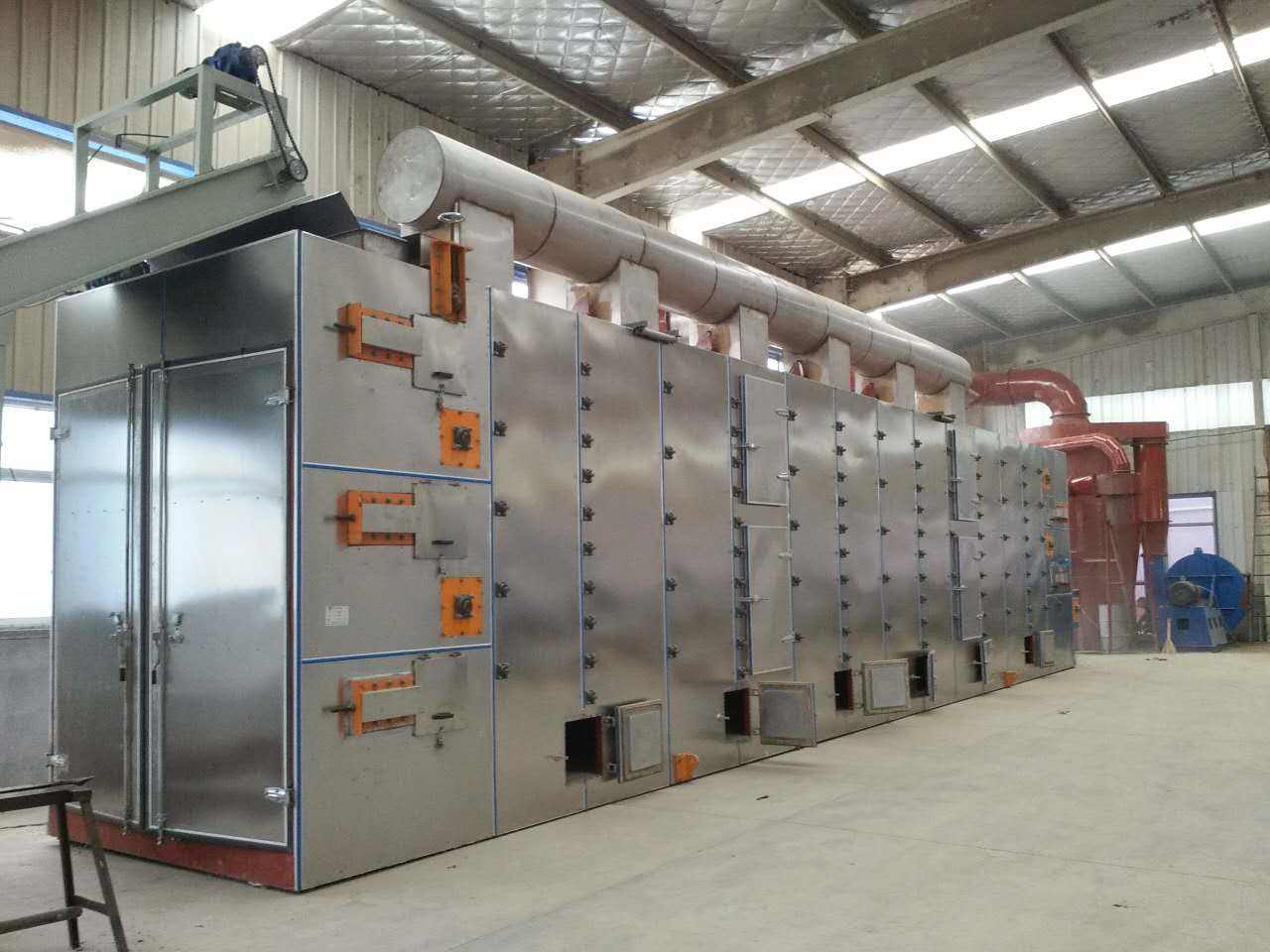 帶式干燥機(jī)是成批生產(chǎn)用的連續(xù)式干燥設(shè)備,用于透氣性較好的片狀、條狀、顆粒狀物料的干燥,對(duì)于脫水蔬菜、催化劑、中藥飲片等類含水率高、而物料溫度不允許高的物料尤為合適;該系列干燥機(jī)具有干燥速度快、蒸發(fā)強(qiáng)度高、產(chǎn)品質(zhì)量好的優(yōu)點(diǎn), 對(duì)脫水濾餅類的膏狀物料, 需經(jīng)造粒或制成條狀后方可干燥。